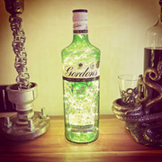 A Grey Goose vodka 70cl bottle light with 100 warm white LEDs inserted inside with 10 metres of exposed silver wiring and the cable exiting through a drilled hole in the back base of the bottle. They are powered by a UK style mains 240V plug with a 1m power cord, so no battery replacements will be required.