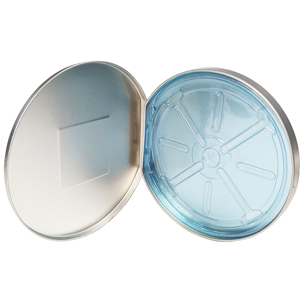 Products » Cases, Packaging and Adhesive Studs » Metal CD circular hinged tin with custom insert for 12cm discs
