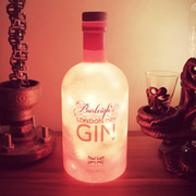 A Berry Bros & Rudd No.3 London Dry Gin 70cl bottle light with 100 warm white LEDs inserted inside with 10 metres of exposed copper wiring and the cable exiting through a drilled hole in the back base of the bottle. They are powered by a UK style mains 240V plug with a 2m power cord, so no battery replacements will be required.