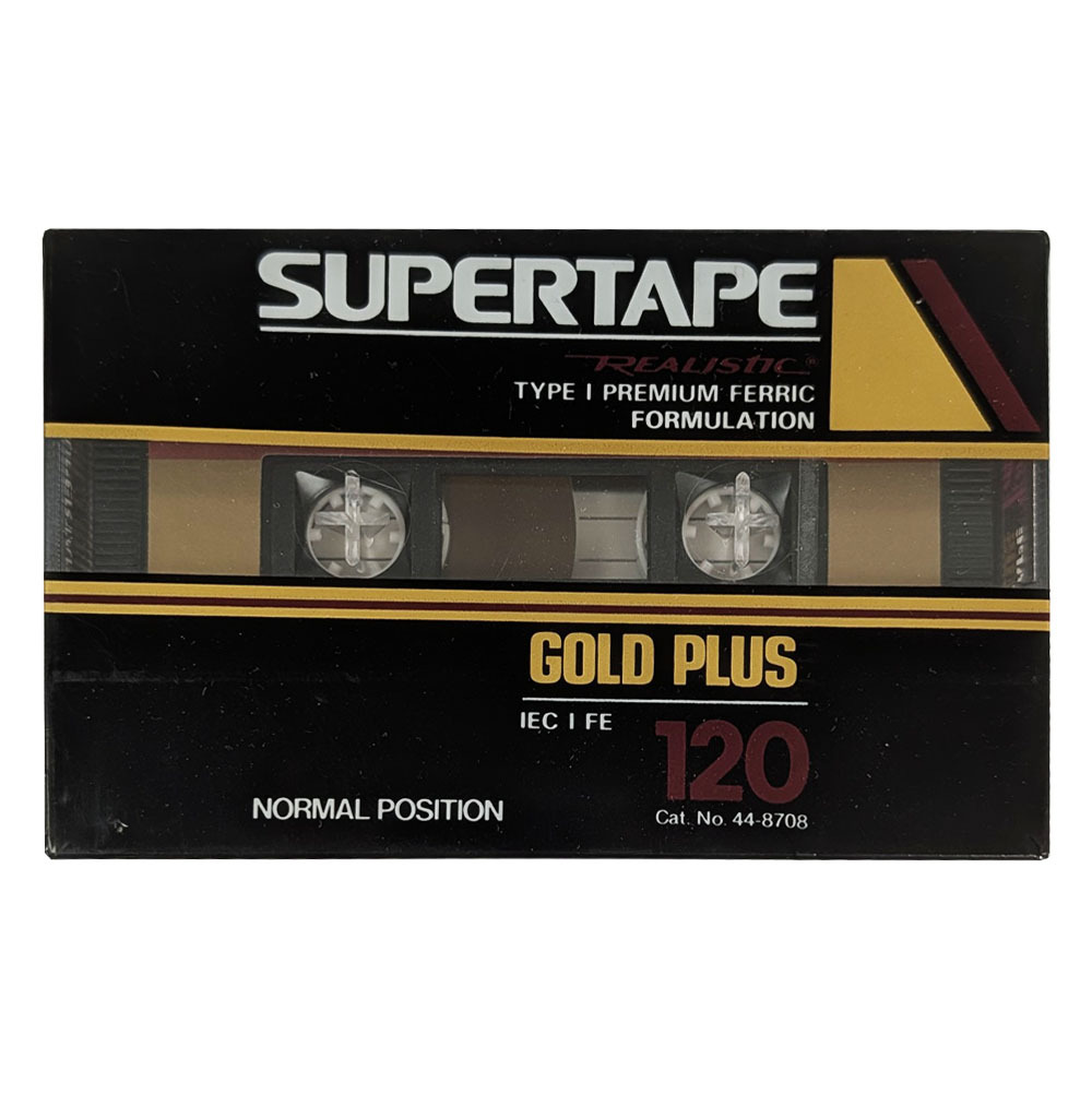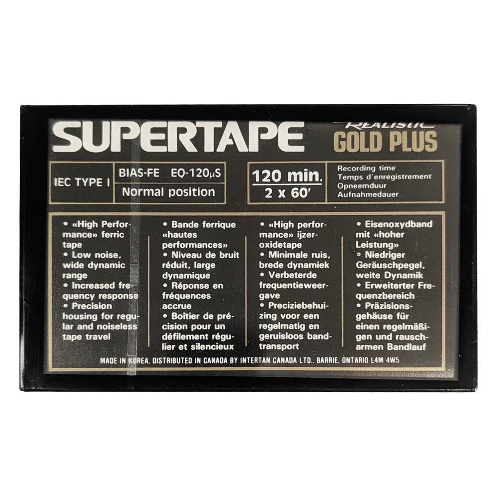 A brand new wrapped Supertape Realistic (Tandy) Gold Plus 120 ferric cassette tape wound to C120 length, so 60 minutes per side with Type I / Ferric tape.