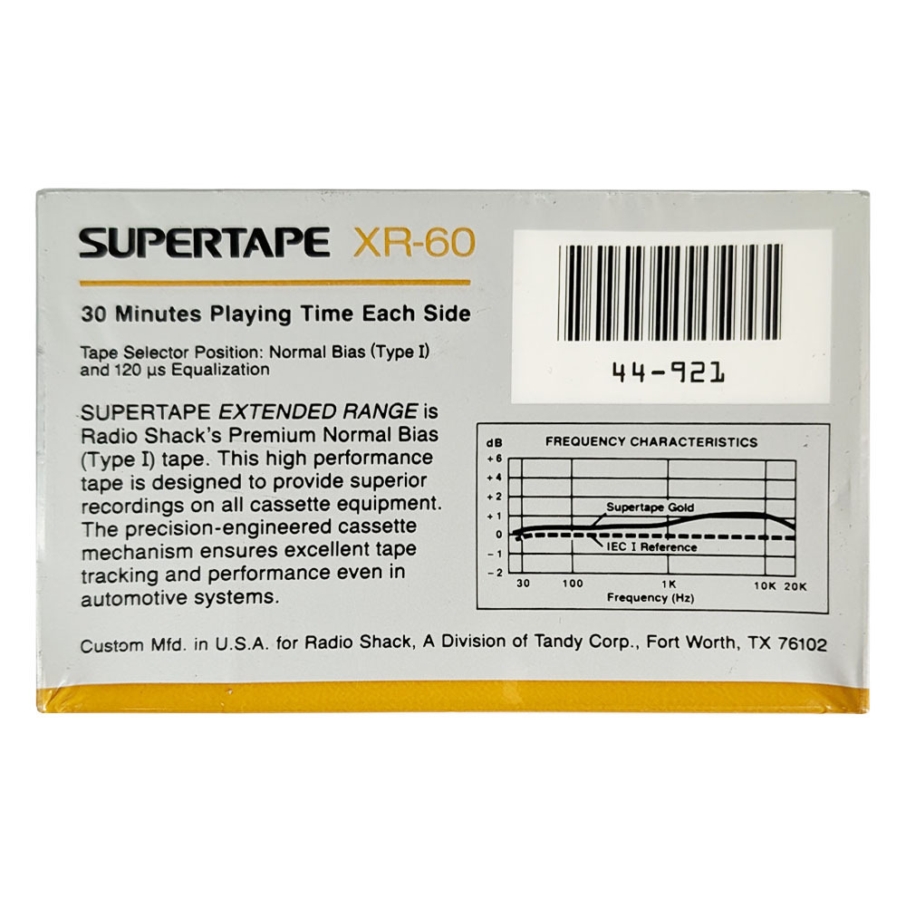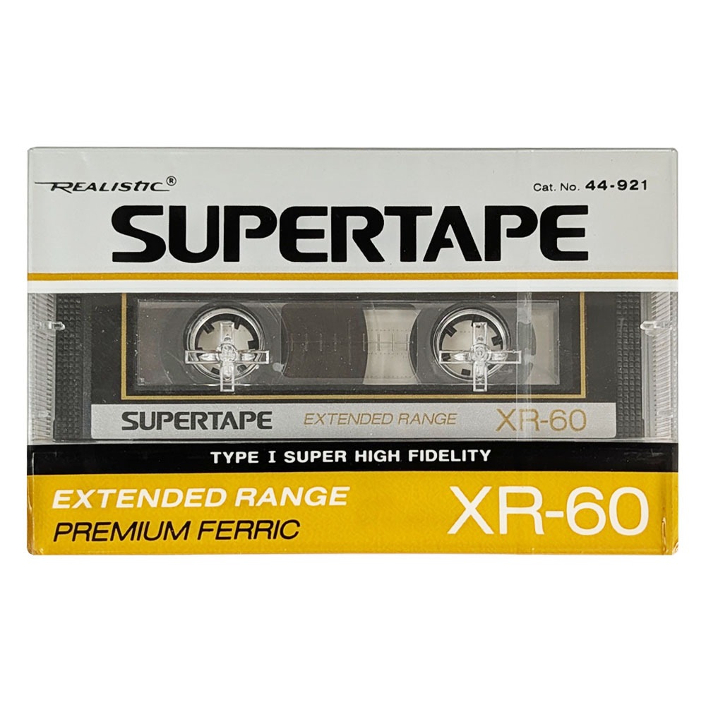 A brand new wrapped Supertape Realistic (Tandy) XR60 ferric cassette tape wound to C60 length, so 30 minutes per side with Type I / Ferric tape.